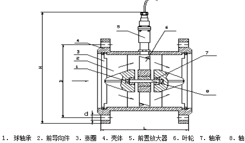 流體流過傳感器外殼。由于葉輪的葉片與流動方向有一定的夾角,流體的沖力使葉片產生轉動力矩。葉片克服摩擦力矩和流體阻力后旋轉。它是在磁場信號檢測器(由線圈和永磁鋼組成)中,旋轉刀片切割線條,周期性變化的線圈磁通,使線圈兩端感應電脈沖信號,信號經過放大器放大塑化,形成一定的連續矩形脈沖波幅值,可遠傳至顯示儀表,顯示流體的瞬時流量或體積。